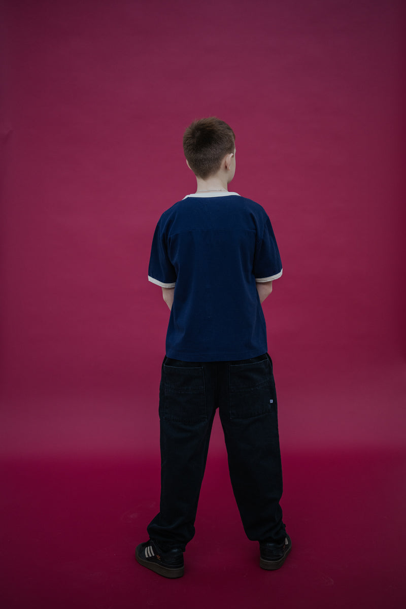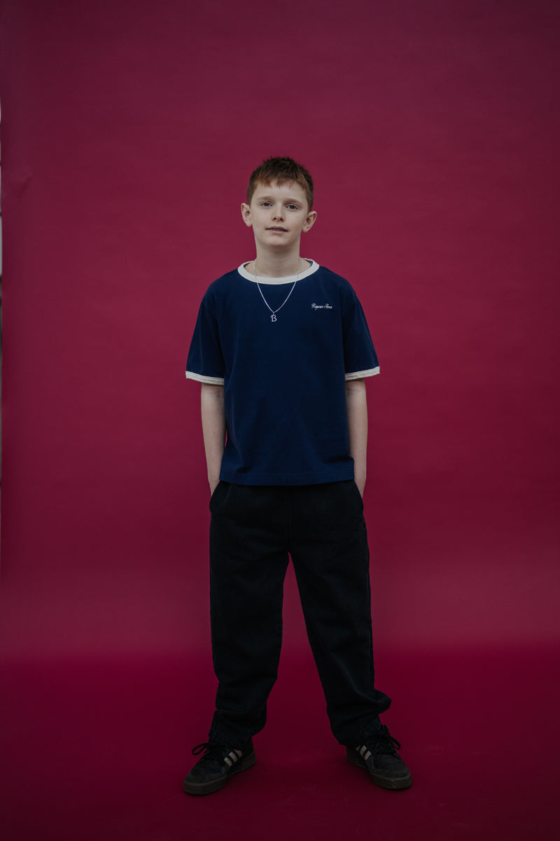 The tee shirt in cosmic navy features a classic shape reimagined with a fresh new approach, showcasing distinctive contrast binding along the neckline and at the edge of the sleeves for a retro touch. This updated interpretation of a beloved design offers refined detailing with enduring appeal.