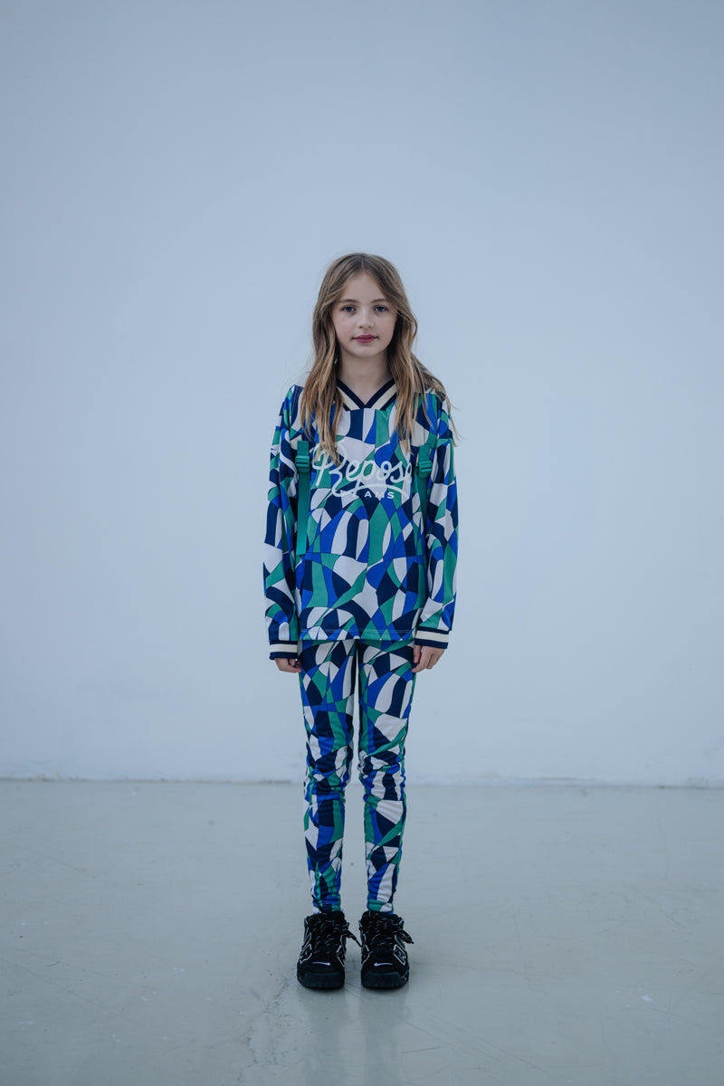 The soccer tee in kaleidoscope print features a V-neck design, crafted from smooth recycled polyester mesh with contrast striped ribbing at the neckline and sleeves. This contemporary piece combines athletic-inspired design with bold geometric patterns for dynamic street style.