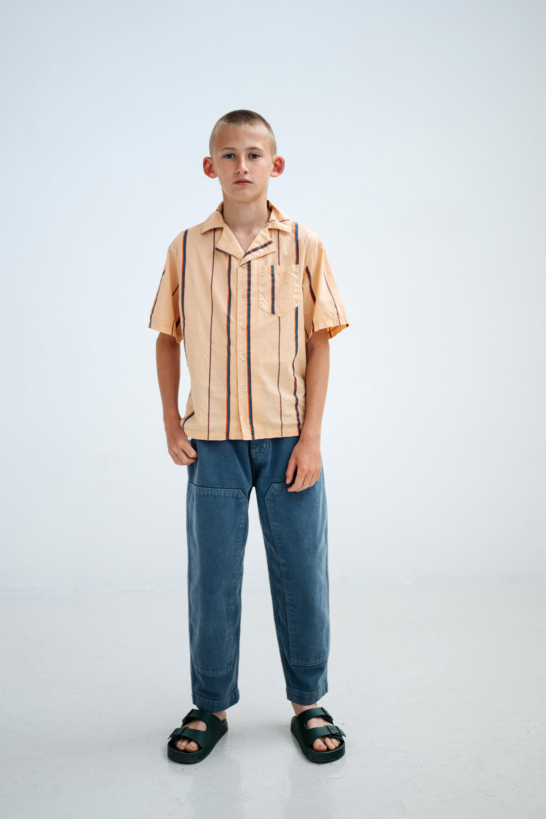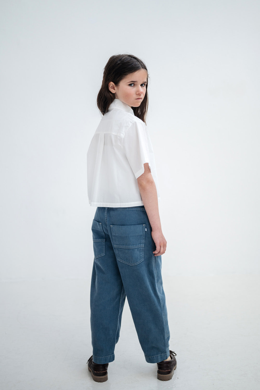 Designed with workwear-inspired practicality, the pants feature classic 5-pocket styling and signature workwear panels on the front, with contrast stitching adding depth and a refined, crafted look. The barrel-shaped leg creates a relaxed, contemporary fit that is wider through the thigh and gently tapers at the ankle, while knee darts allow for ease of movement. An adjustable inner waistband with elastic and buttons ensures a flexible, growing with you fit.
