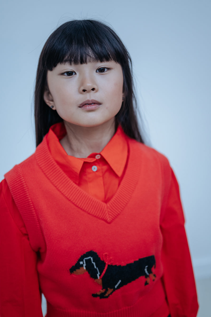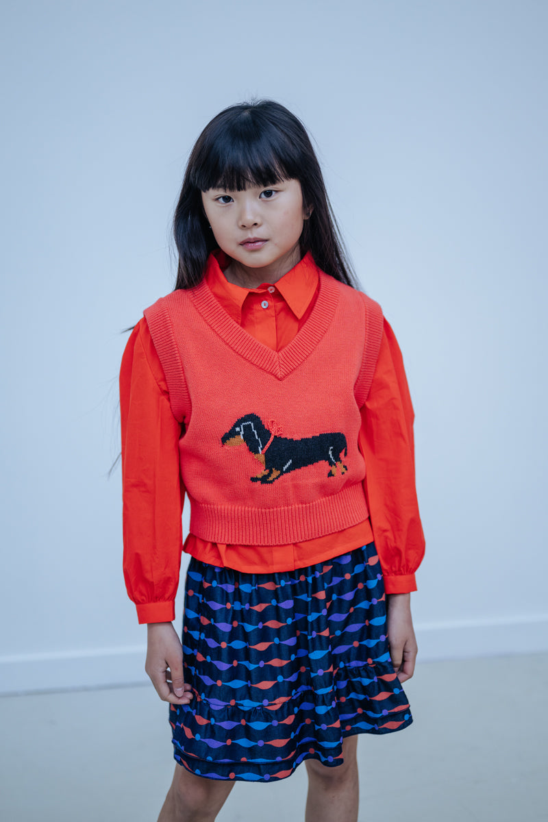 Add a playful touch to any outfit with our V-neck spencer featuring a charming dog motif. The vibrant radiant red color paired with the dog detail creates a piece that's both stylish and fun.