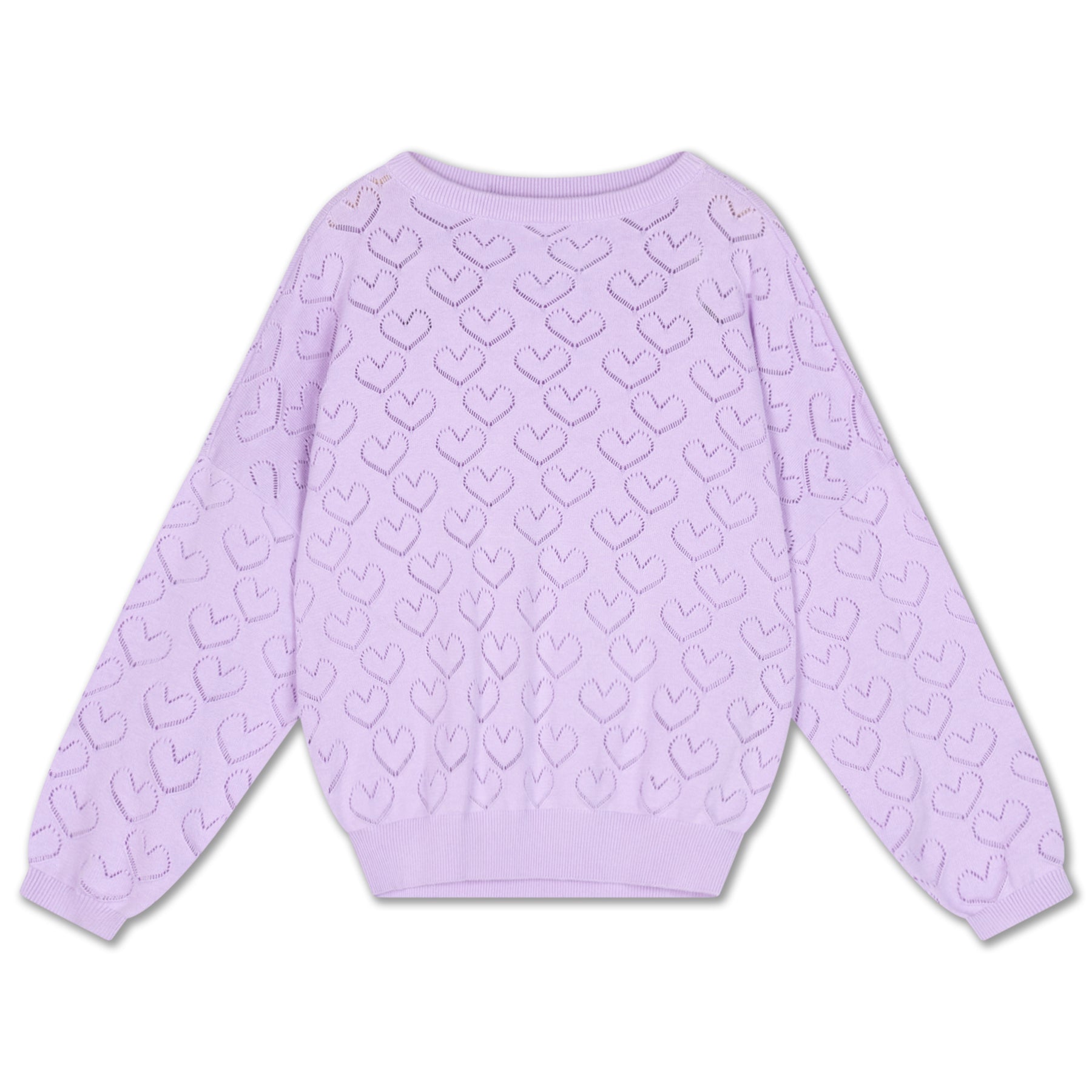In a soft glacier bloom (lilac) colourway with a delicate ajour heart pattern, this lightweight knit sweater combines playful detail with effortless comfort. Crafted from 100% cotton yarn in a relaxed oversized fit with a round neckline and soft bat sleeves, it features an airy open knit structure that creates subtle heart motifs for a charming, contemporary look.
