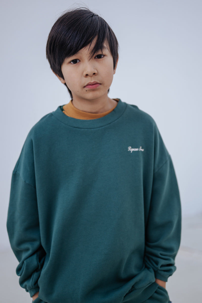 The cozy drop sweater in country green is crafted from soft organic cotton fleece (brushed on the inside) and features a round neckline with distinctive drop shoulder construction. Its new oversized fit and serene country green color create an eye-catching look that's both sophisticated and cool - no need to size up for the perfect laid-back fit. The subtle embroidered logo in contrast detail adds a minimalist touch to this versatile wardrobe staple.