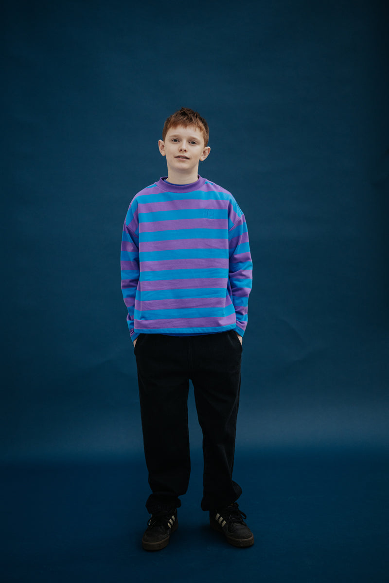 The oversized boxy sweater in cool pool violet block stripe is crafted from yarn dyed organic cotton. Shaped in a boxy straight fit, it features dropped shoulders, vibrant block stripes in cool pool and violet tones, an embroidered logo on the chest and a round, ribbed neck. Yarn-dyed fabric is made by dyeing the threads before weaving, creating a rich outlook and lasting color.