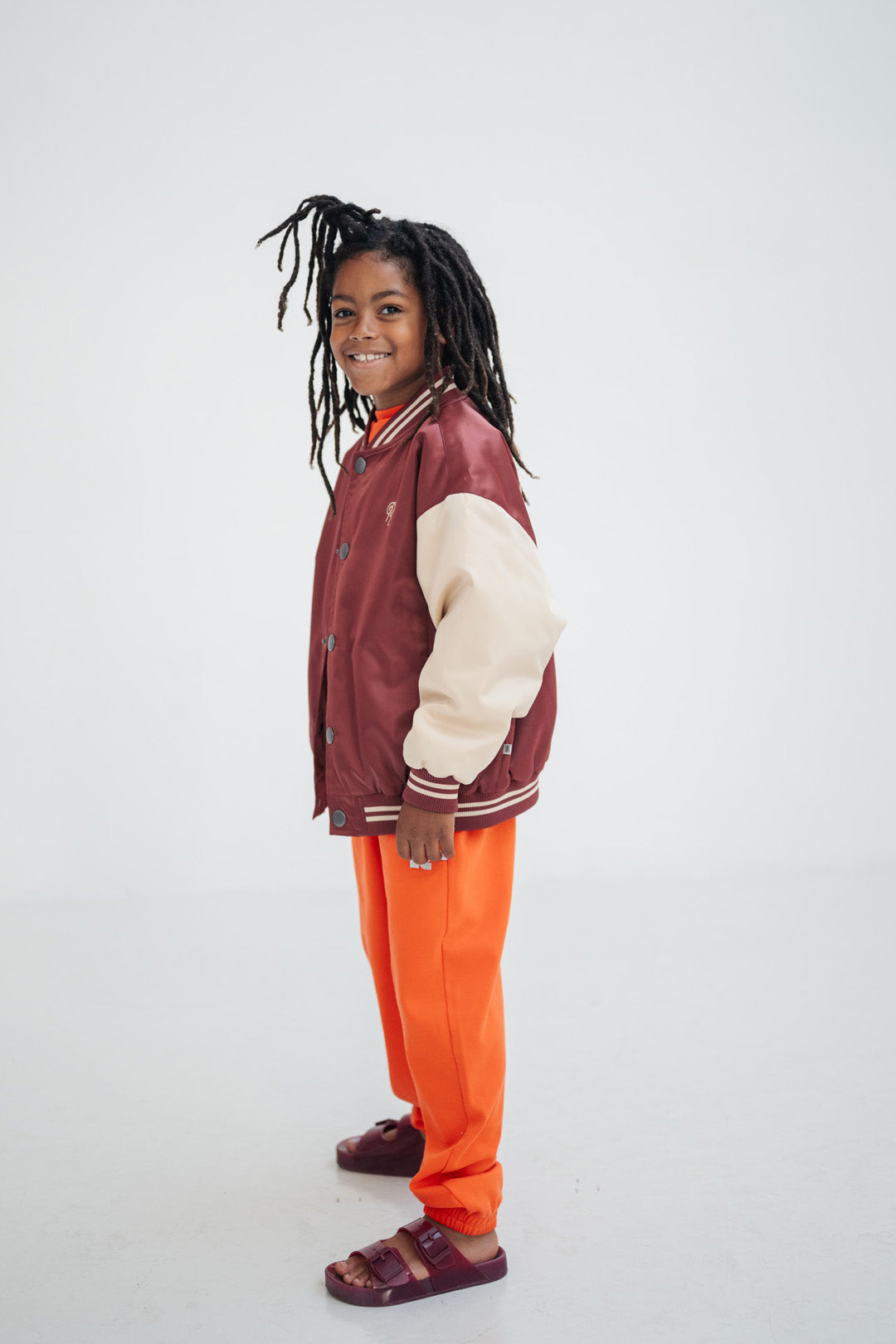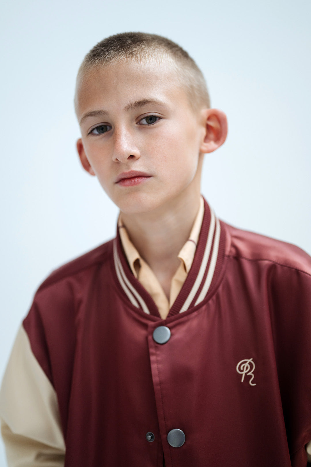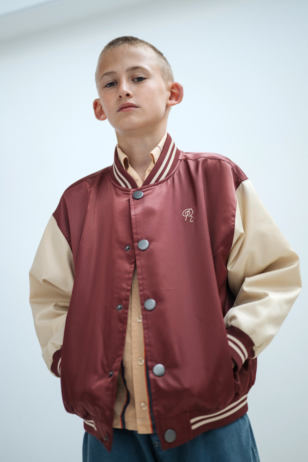 In a rich cherrywood and sand color block design, this baseball jacket delivers classic varsity appeal with contemporary style. Cut from 100% recycled polyester satin with a distinctive bomber silhouette, it features contrasting sand sleeves and embroidered "Repose AMS" branding on the back that adds signature detail and visual interest.