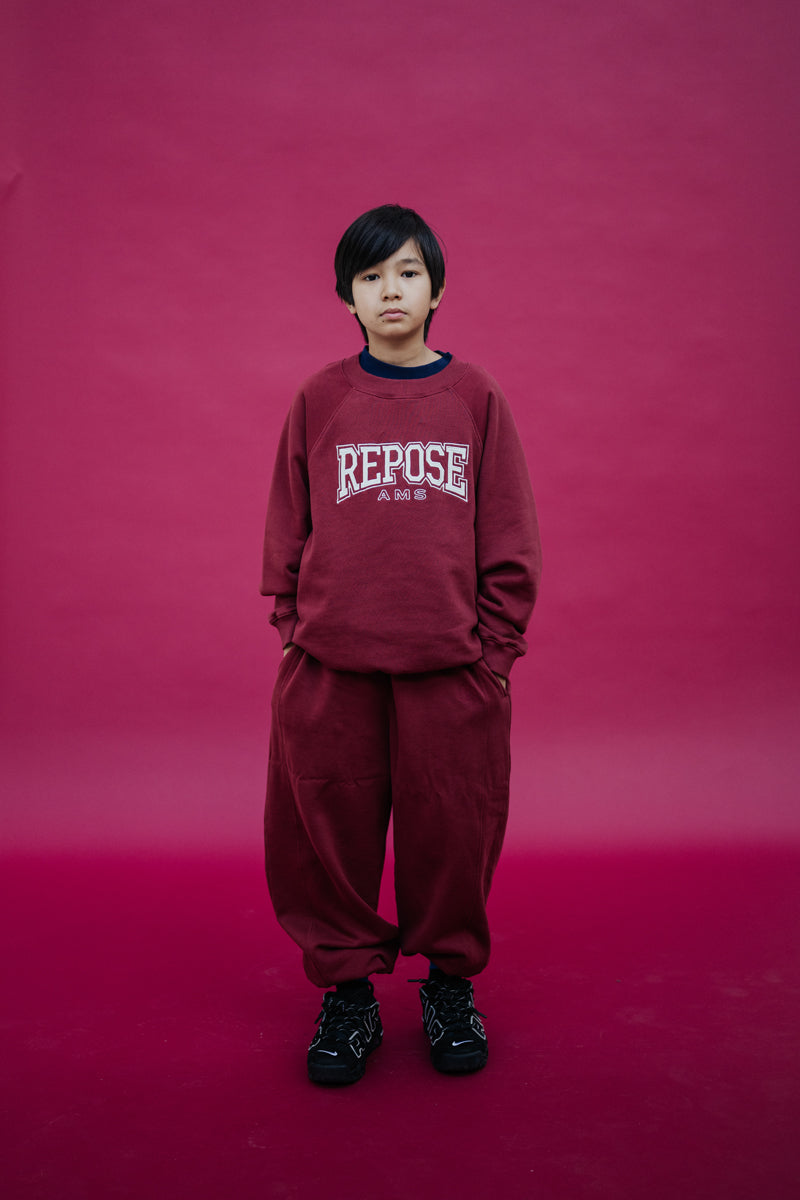 The raglan sweater in royal burgundy is crafted from premium organic cotton fleece (brushed on the inside) and features the iconic college style REPOSE AMS logo in bold white lettering. Its classic raglan sleeve construction and comfortable crew neckline create a timeless look that's perfect for everyday wear. The rich burgundy colorway adds sophistication while maintaining the relaxed, effortless style REPOSE AMS is known for.