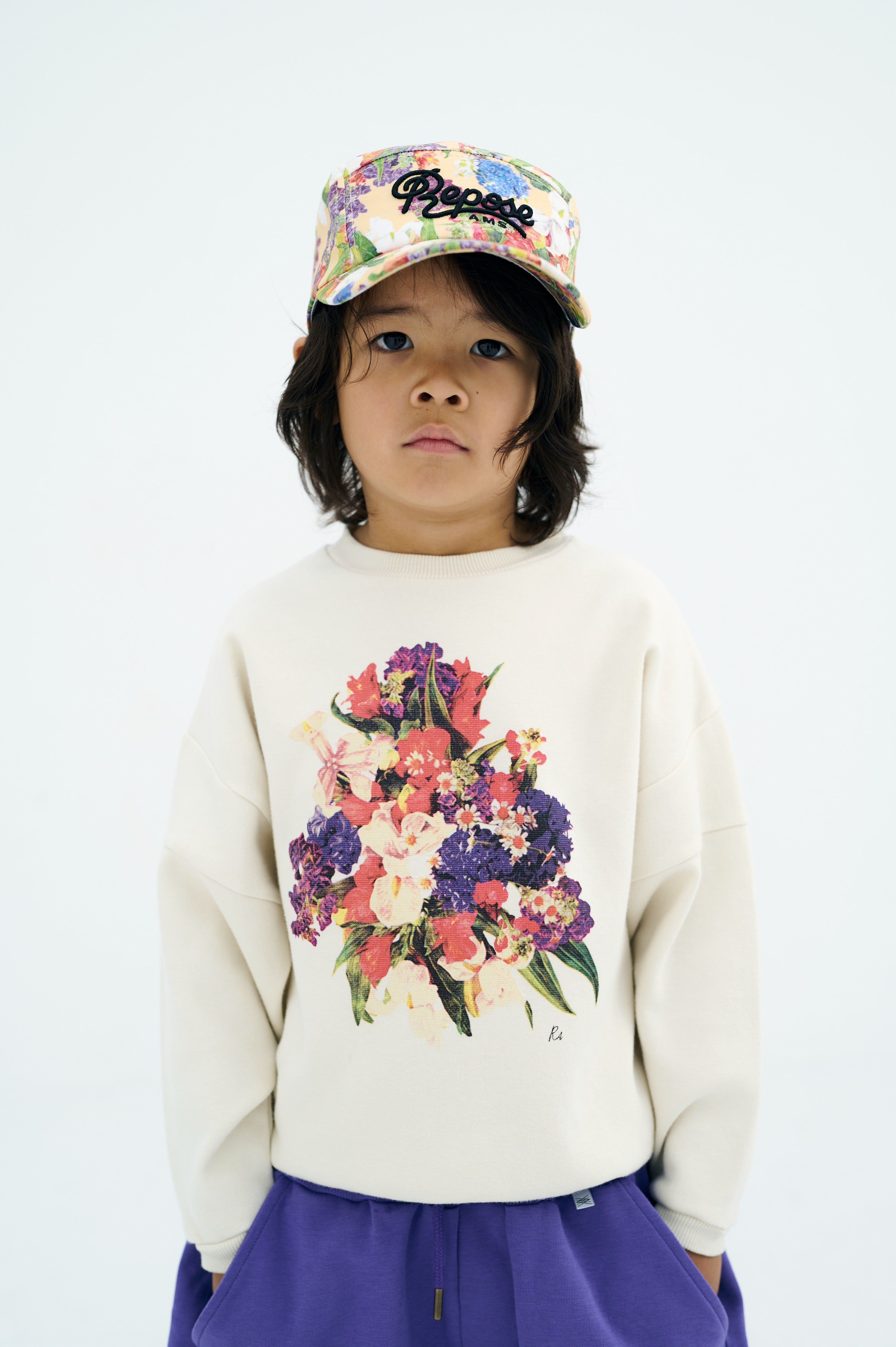 Entdecken und genießen Sie unseren kultigen Rundhalspullover mit tollem Blumenmuster. Er hat eine sehr bequeme, leicht übergroße Passform und ist in einem sanften Elfenbeinton erhältlich.