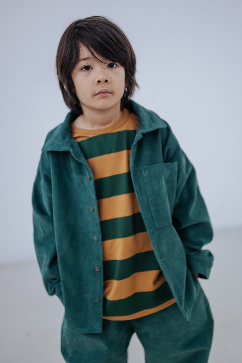 The wide cut longsleeve in a yarn dyed gold country green block stripe features a new shape with a round neck and oversized look, This versatile piece offers contemporary comfort with timeless appeal.