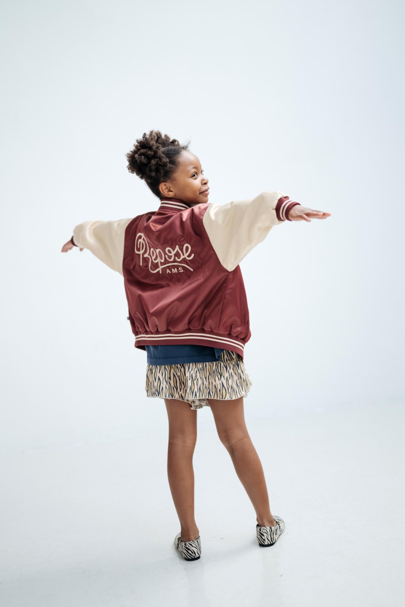 In a rich cherrywood and sand color block design, this baseball jacket delivers classic varsity appeal with contemporary style. Cut from 100% recycled polyester satin with a distinctive bomber silhouette, it features contrasting sand sleeves and embroidered "Repose AMS" branding on the back that adds signature detail and visual interest.