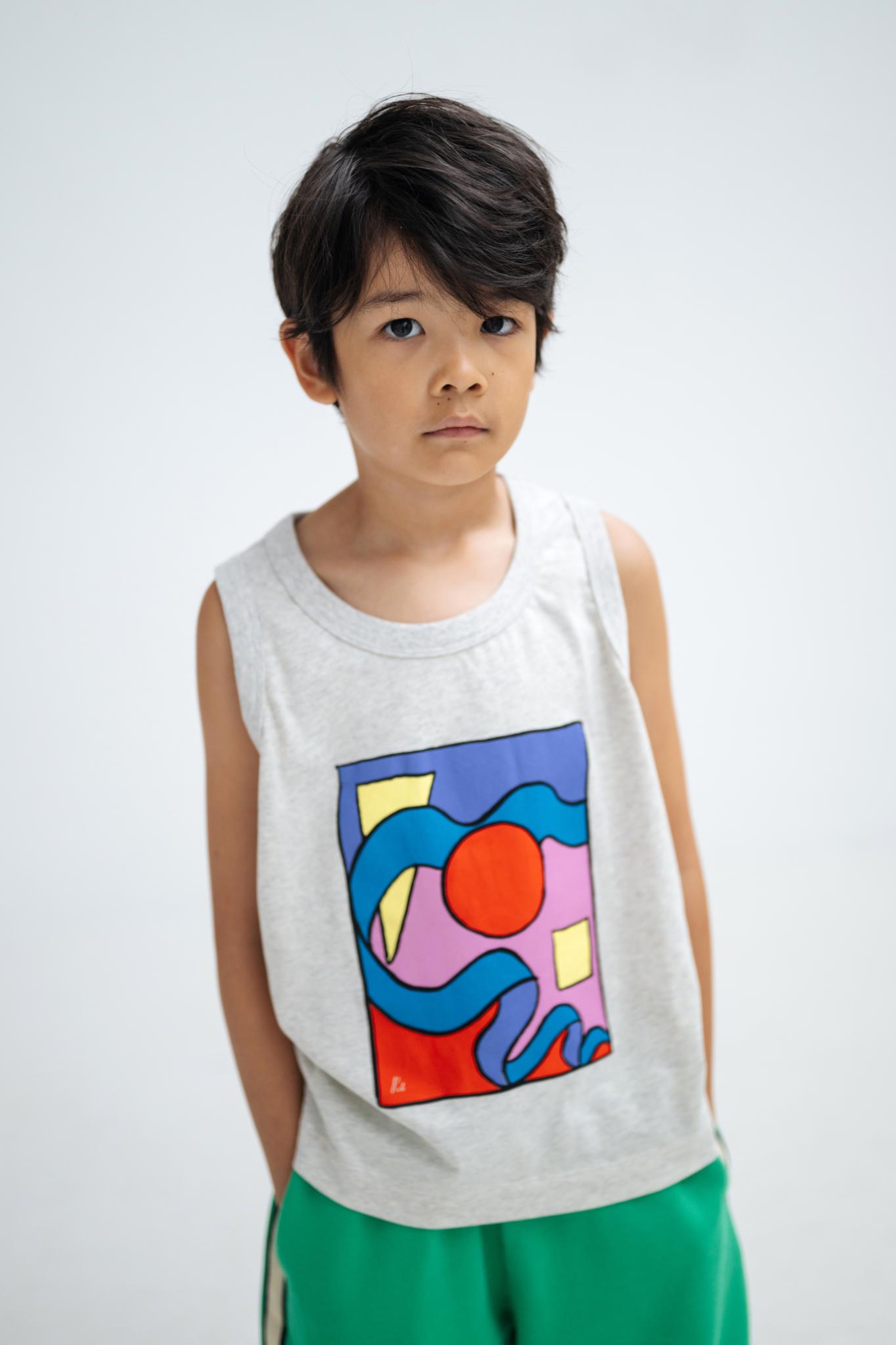 In a soft light mixed cream base with a vibrant graphic print, this Singlet brings playful color and relaxed summer style. Cut from 100% organic cotton in a straight-cut, looser silhouette, it features a bold abstract artwork in shades of blue, coral, and yellow that adds artistic appeal and standout charm.
