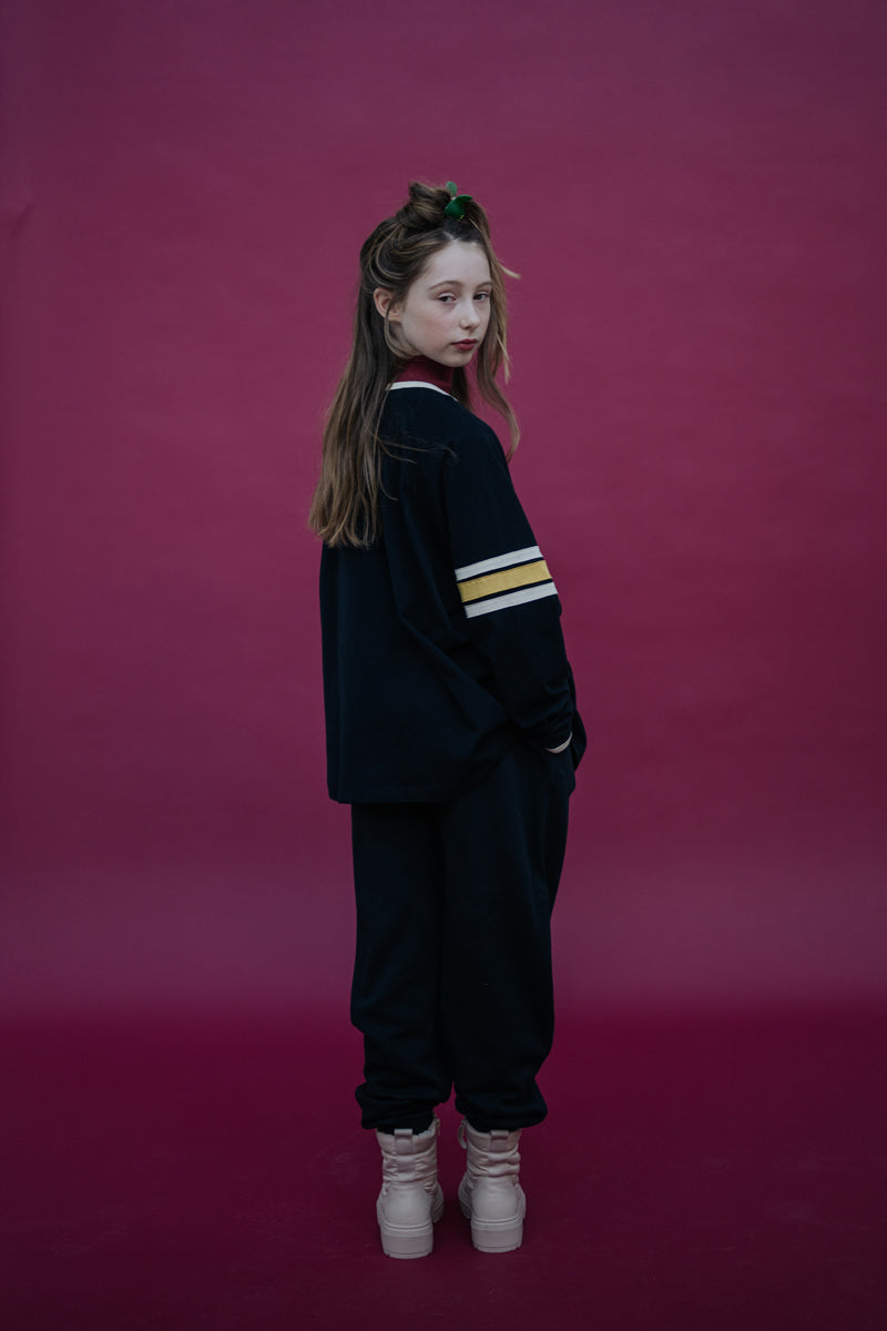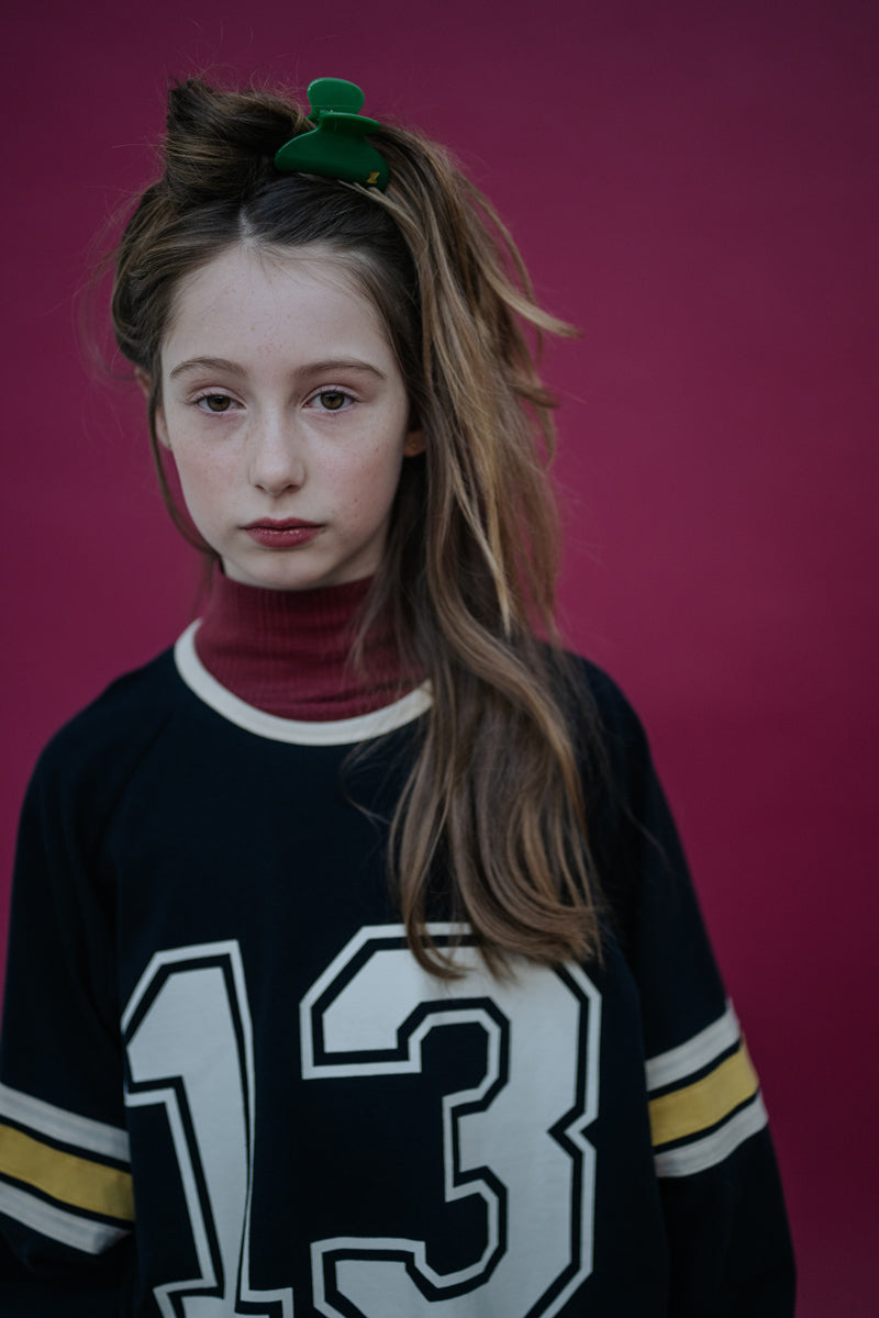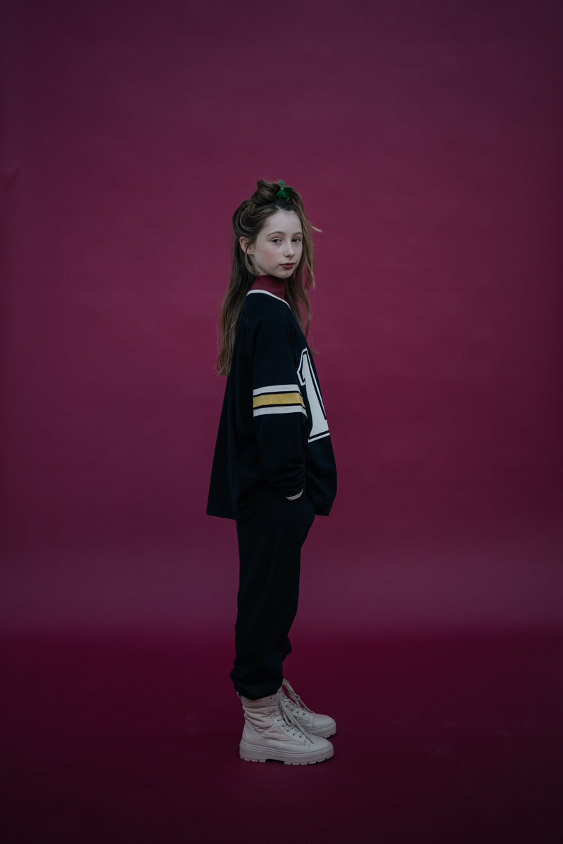 Das Raglan-Jersey-Langarmshirt in graphite night ist aus hochwertigem Bio-Baumwolljersey gefertigt. Es verfügt über einen entspannten Schnitt, einen auffälligen "13"-Druck auf der Brust, gestreifte Rippenbündchen an den Ärmeln und Kragen in gelb und weiß sowie lange Ärmel für einen sportlichen Varsity-Look.