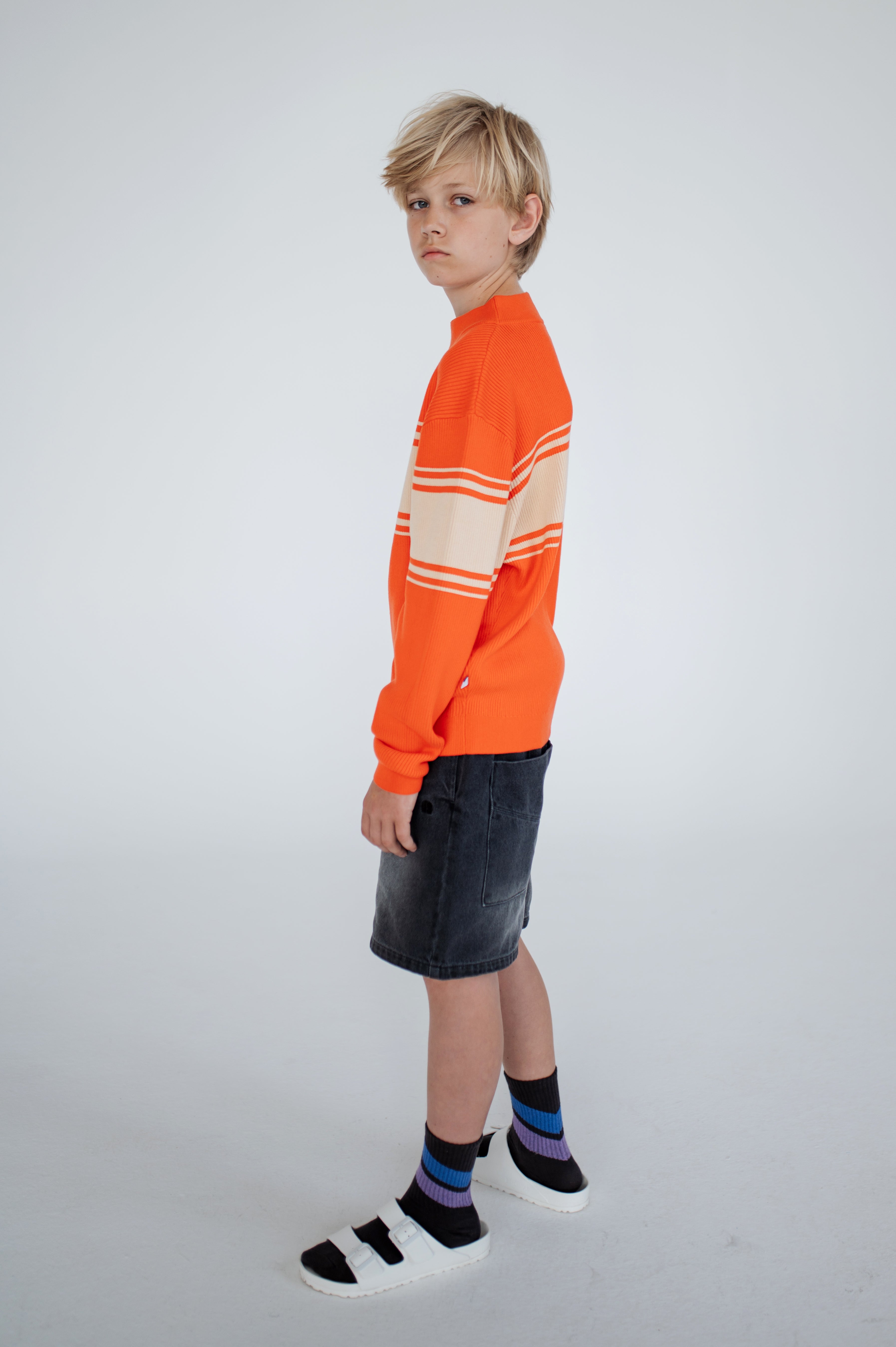 Der superweiche Strickpullover mit Fiesta-Rot-Sandfarbigen Streifen hat eine bequeme Passform und verfügt über überschnittene Schultern sowie gerippten Halsausschnitt, Bündchen und Saum.