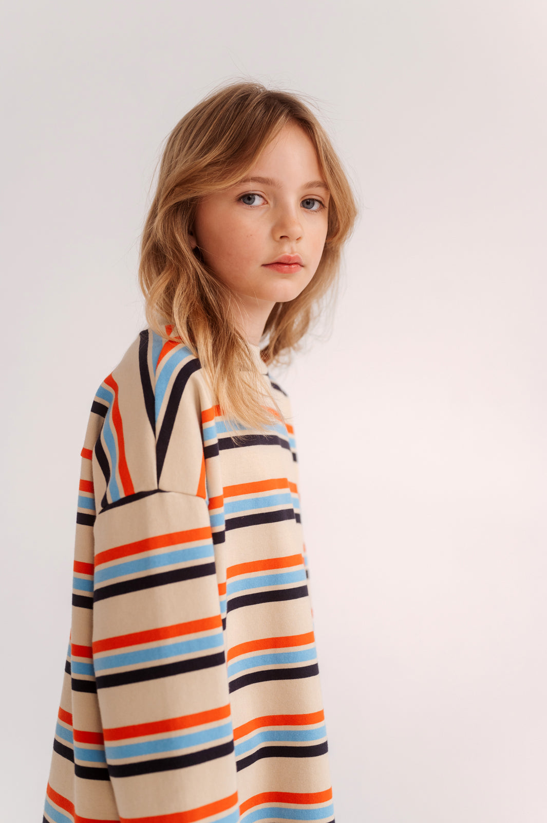 Das übergroße, kastige Sweatkleid in mehrfarbigem Crème-Brûlée-Streifenmuster ist aus garngefärbter Bio-Baumwolle mit Interlock-Effekt und leichtem Stretchanteil für zusätzlichen Tragekomfort gefertigt. Im kastig geschnittenen Schnitt mit überschnittenen Schultern, gesticktem Logo auf der Brust und gerippten Abschlüssen an Halsausschnitt, Bündchen und Saum. Ein gewebtes Markenetikett in der Seitennaht rundet das Design ab.