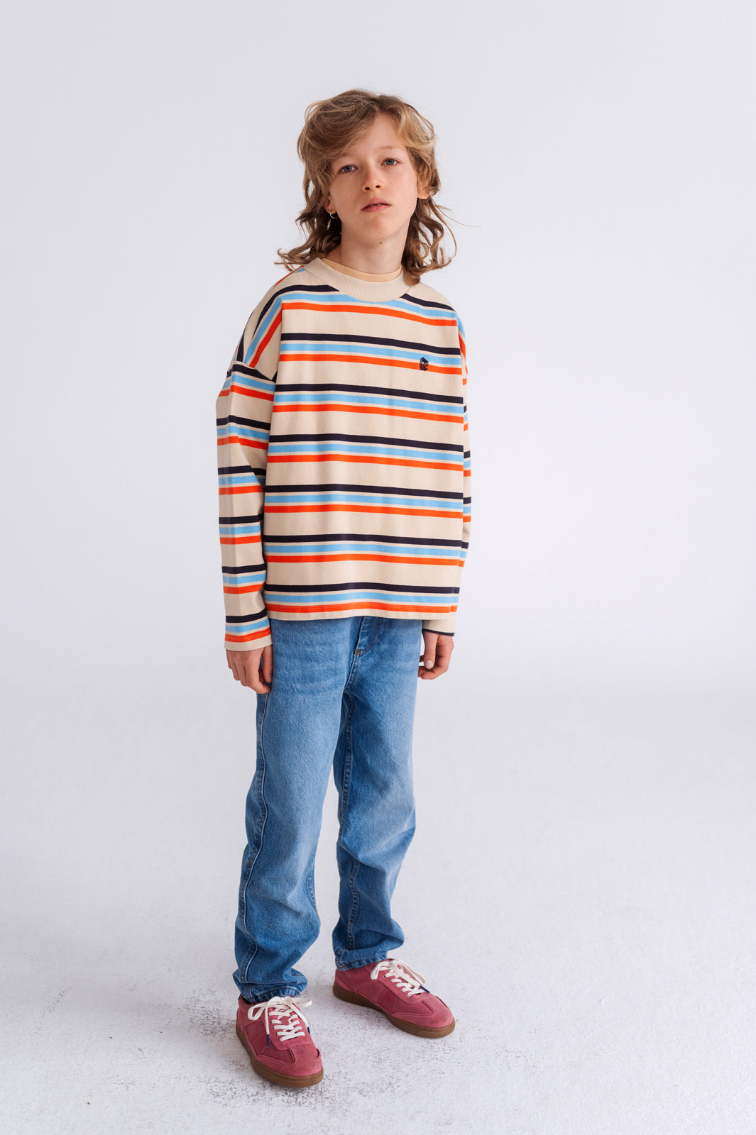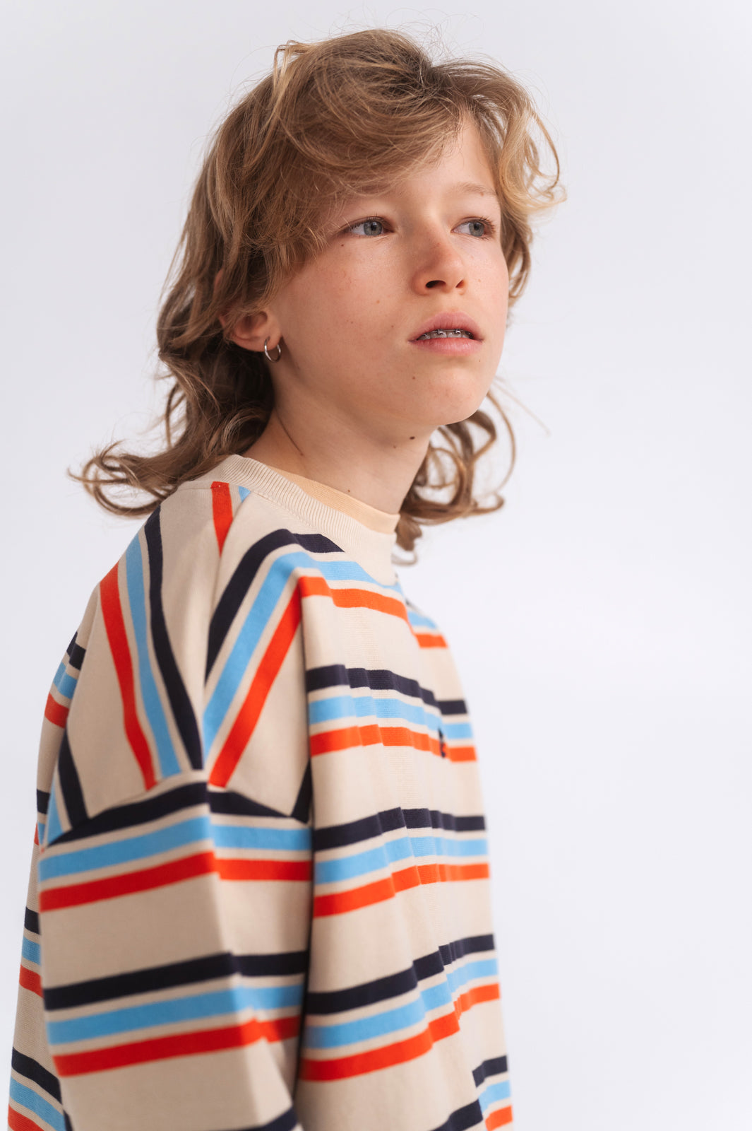 Der übergroße, kastige Pullover mit mehrfarbigen Crème-Brûlée-Streifen ist aus garngefärbter Bio-Baumwolle mit einem Hauch von Stretch für zusätzlichen Tragekomfort gefertigt. Er hat eine kastige Passform mit überschnittenen Schultern, einem gestickten Logo auf der Brust und gerippten Abschlüssen an Halsausschnitt, Bündchen und Saum. Ein gewebtes Markenetikett in der Seitennaht rundet das Design ab.