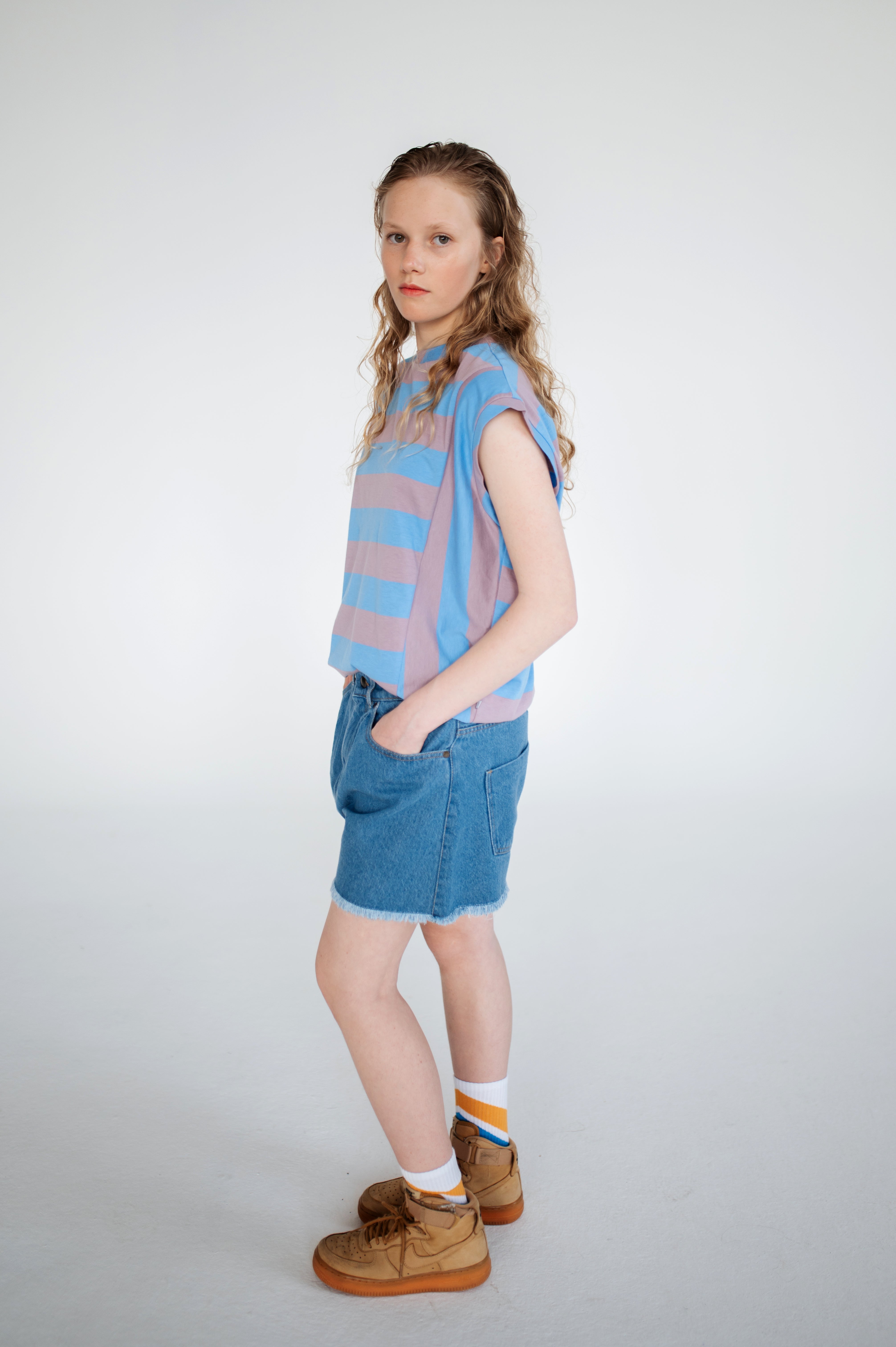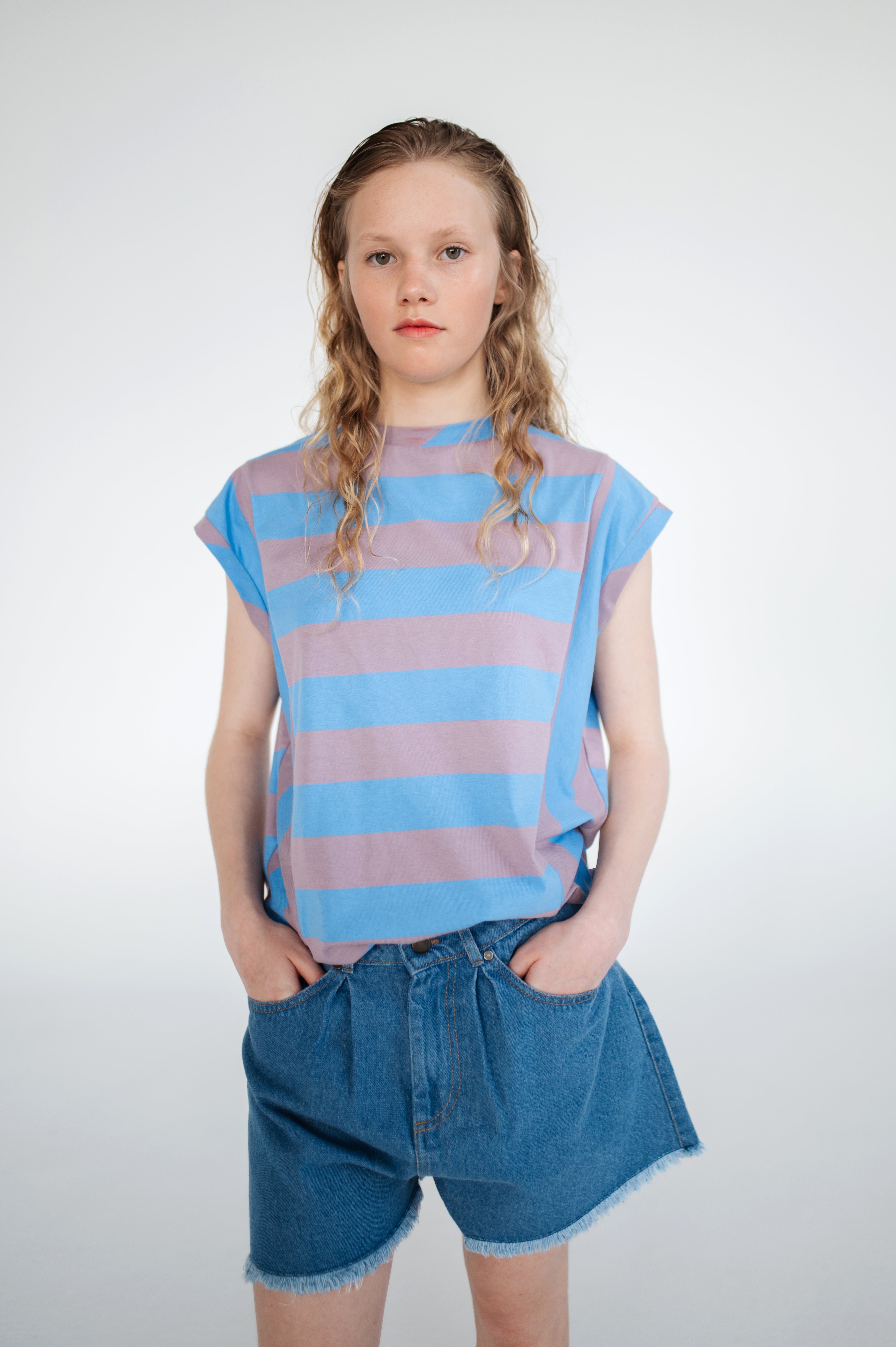 Entdecken Sie einen unserer luftigen Sommerstyles: das T-Shirt in Himmelblauen Holunderfarbigen Streifen, gefertigt aus weichster Bio-Baumwolle für optimalen Tragekomfort an wärmeren Tagen. Dieses Top besticht durch eine wunderschöne Silhouette mit kurzen Ärmeln, Rundhalsausschnitt und lässiger Passform. Das Streifenmuster verleiht einen verspielten Touch, mit horizontalen Streifen in der Mitte und vertikalen Streifen an den Seiten für einen einzigartigen und auffälligen Look.
