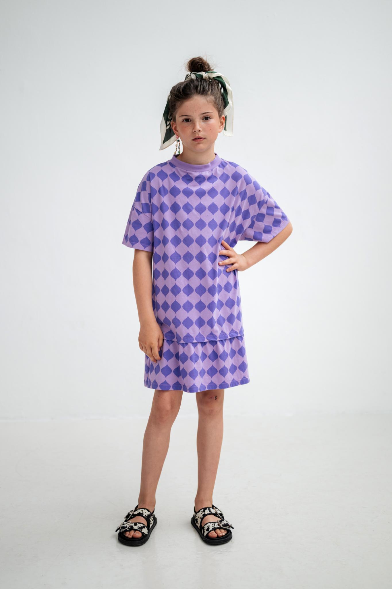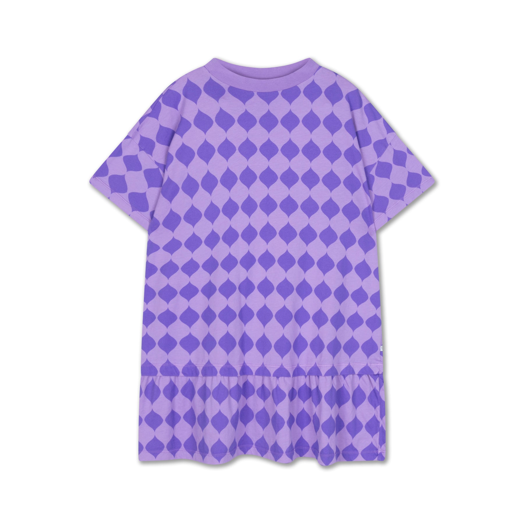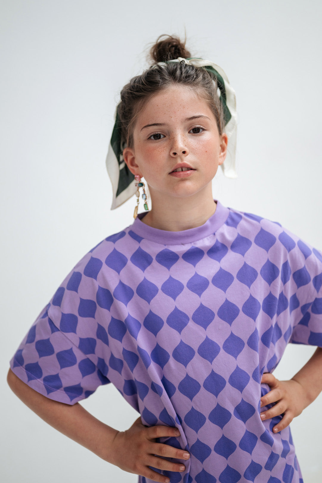 In a playful soft harlequin pattern, this Bottom hem ruffle dress combines relaxed comfort with unexpected detail. Cut from 100% organic cotton in an oversized boxy silhouette, it features a purple diamond print that adds a contemporary appeal.