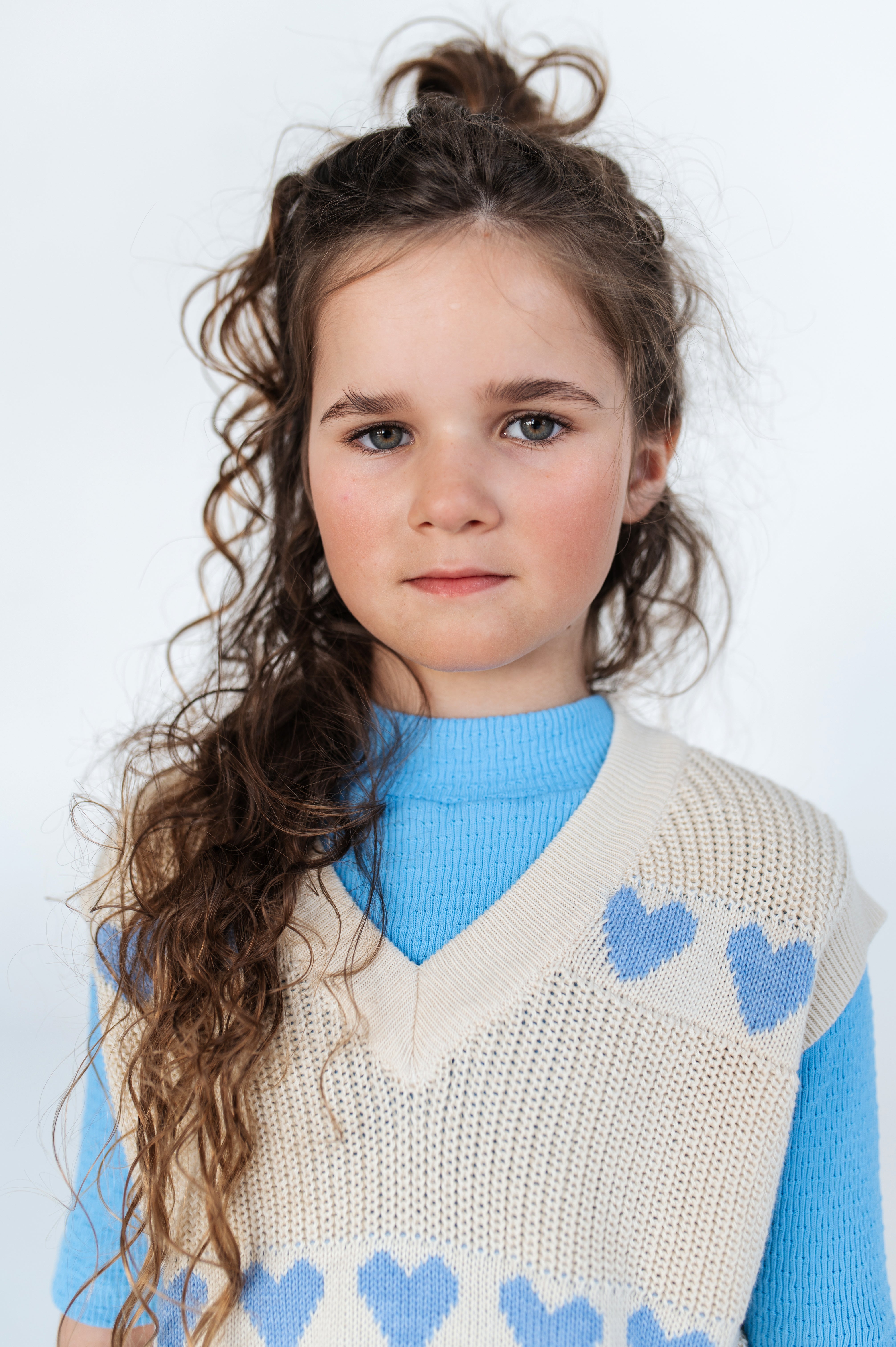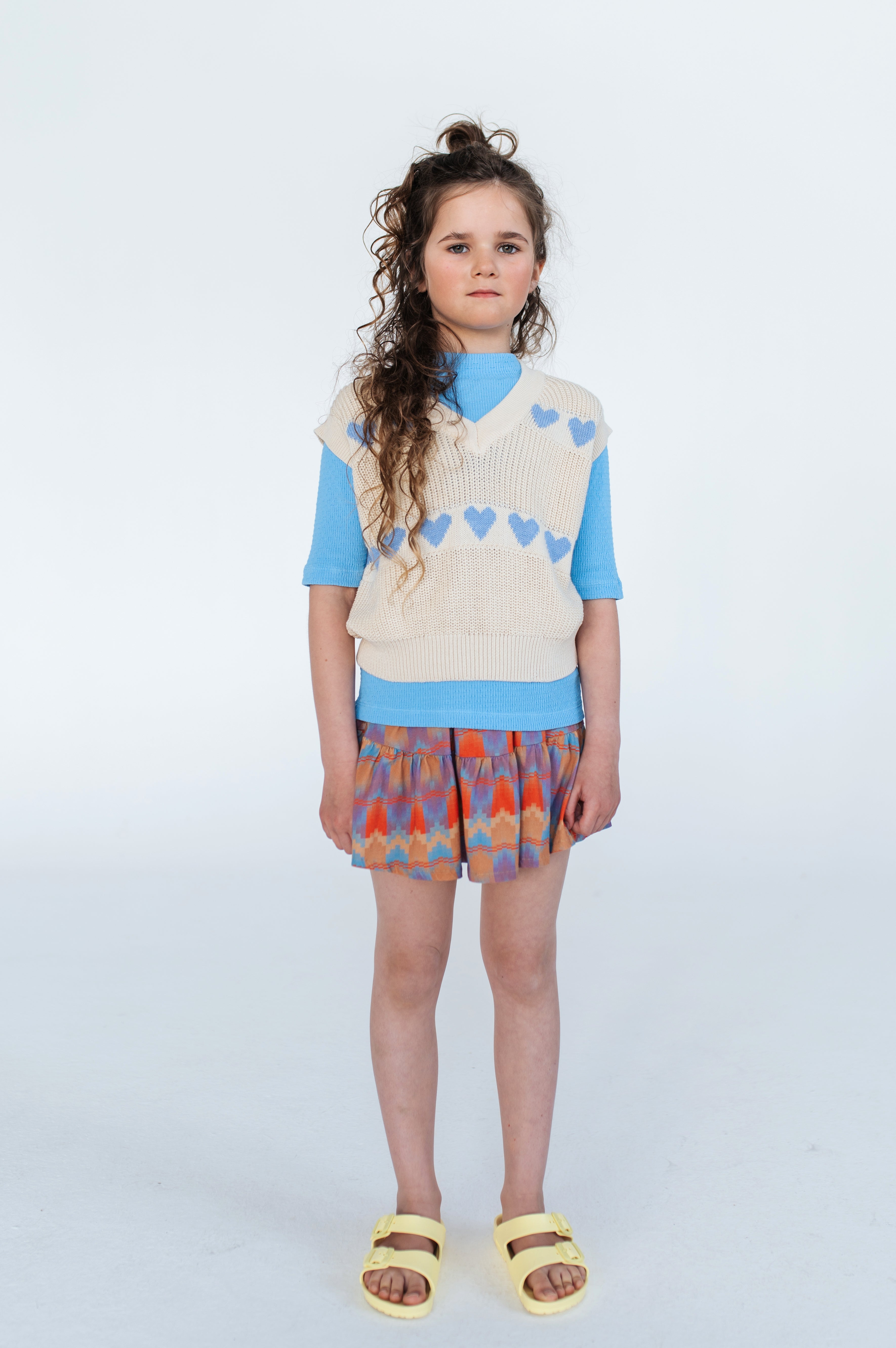 The super soft and cozy knit spencer in summer day blue hearts, features a shorter body and ribbed V-neck, armholes, and hem.