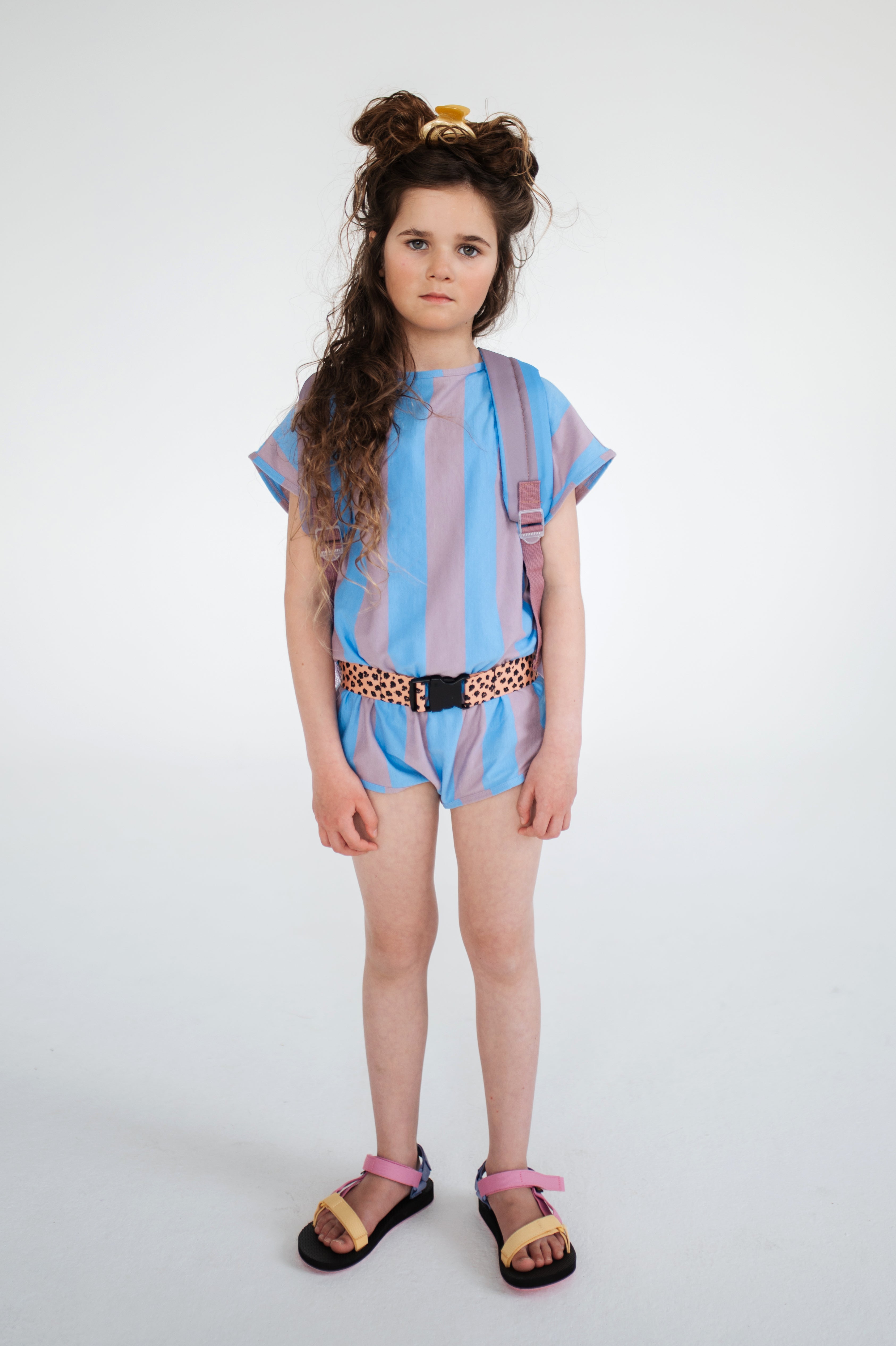 The playsuit in summer blue elderberry stripe is made from yarn-dyed organic cotton jersey. It is designed with snap buttons in the crotch for easy dressing, a button and keyhole closure on the back, short sleeves and legs and a soft elastic waist. Easy to pair with shorts, jeans or a skirt.