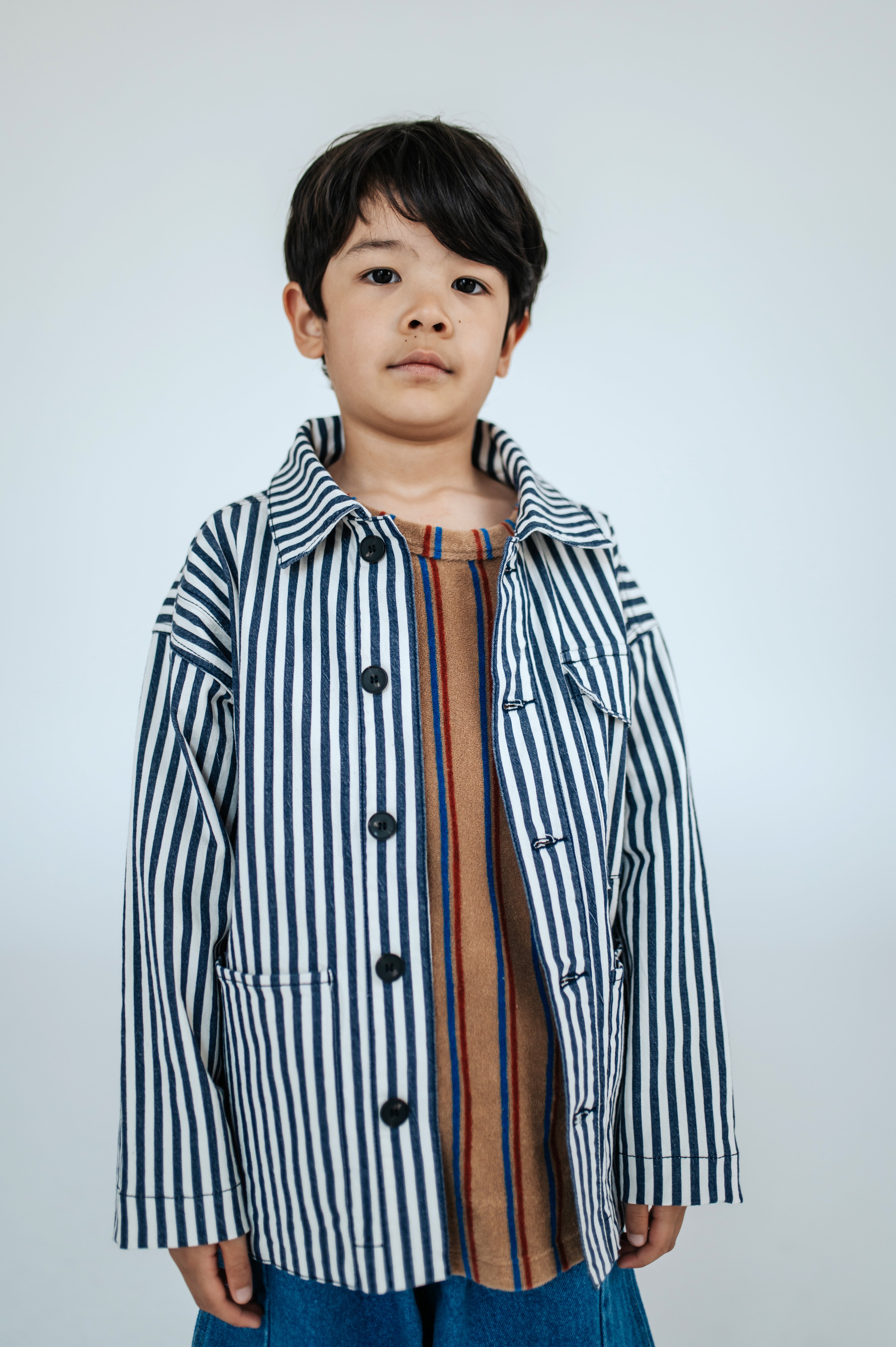 The pocket jacket in navy eggshell stripe is made from organic cotton and features a relaxed fit with dropped shoulders. It has a classic collar, a chest flap pocket, two front patch pockets and contrasting black buttons. Inspired by workwear, this versatile jacket is perfect for layering and suits a variety of occasions. Pair it with the matching wide pant in navy eggshell stripe for a coordinated look.
