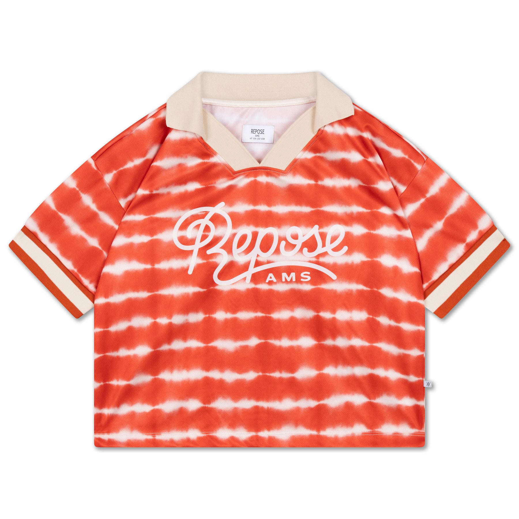 Designed with a contrasting ribbed collar and sleeve cuffs, the jersey features the Repose AMS logo on the front and the number 13 on the back, adding a nostalgic sportswear touch. The vibrant tie dye pattern ensures each piece carries its own unique character.
