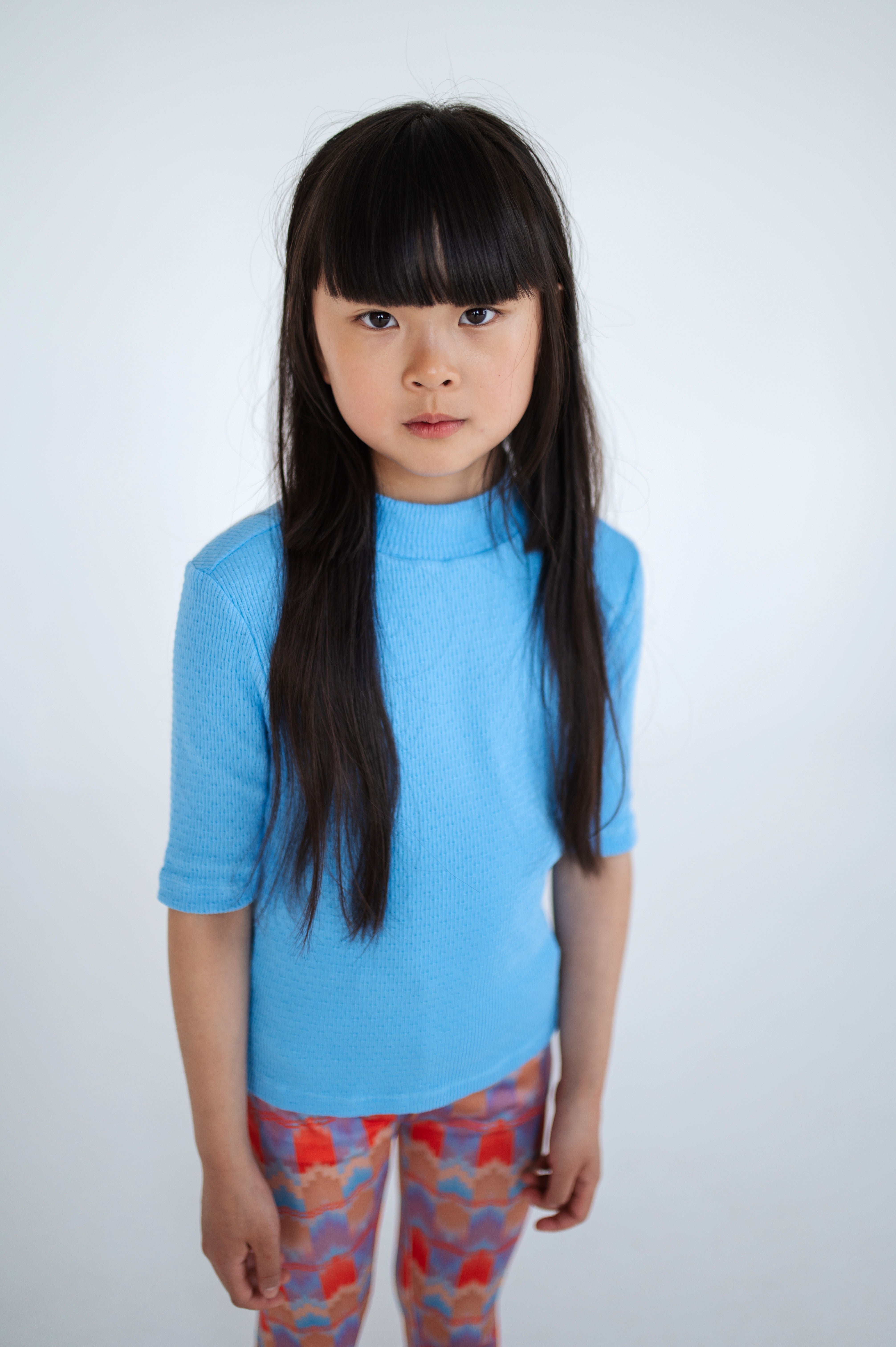 Crafted from organic fancy ajour cotton, the turtle neck in summer day blue has a soft, textured feel with a delicate, breathable pattern. This short-sleeved piece features a higher neck along with a comfortable, snug fit, making it perfect for layering or wearing on its own.