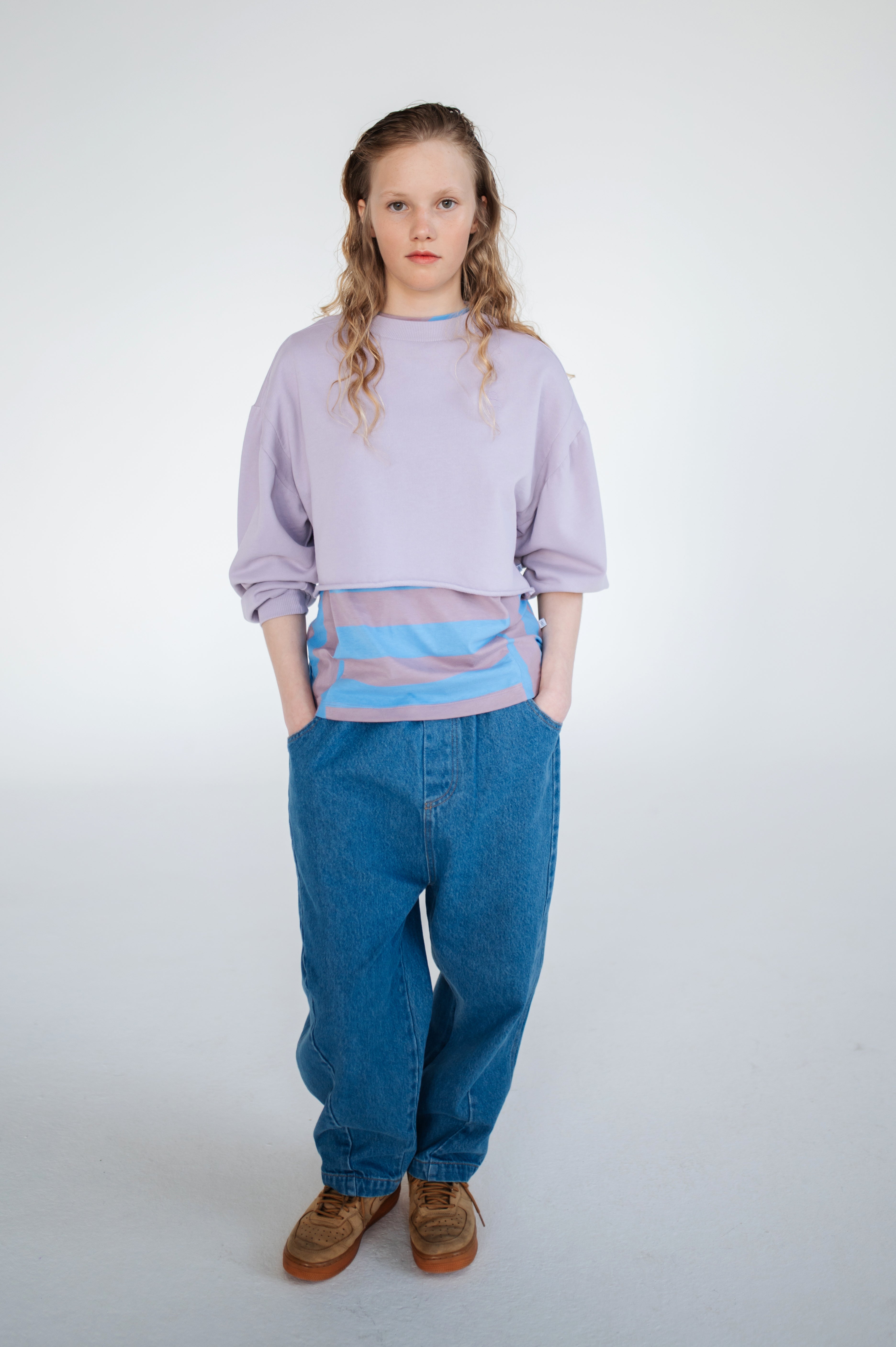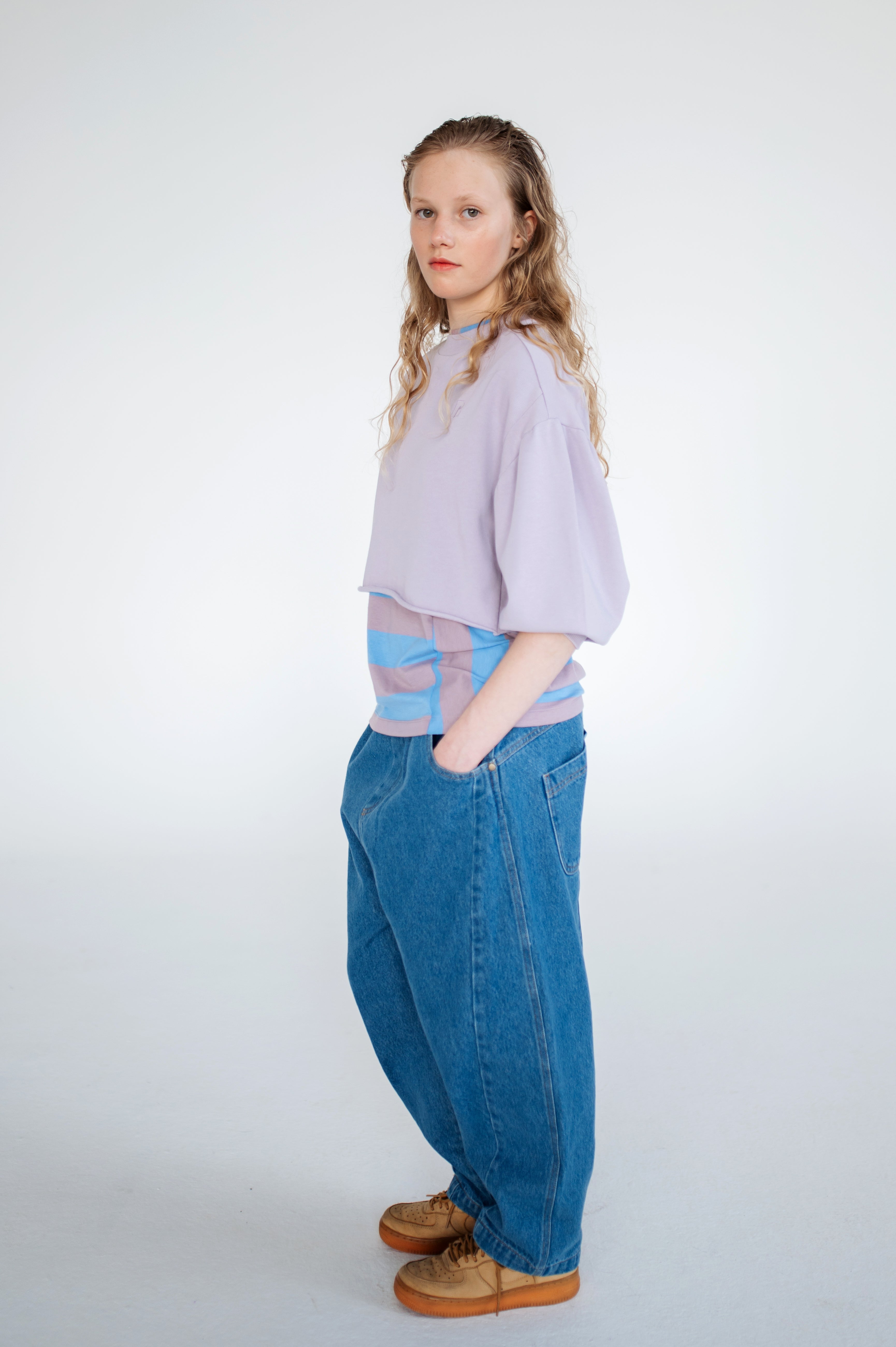The wide pant in medium blue, cut from soft organic cotton denim, is designed for a loose, wide fit with a slightly cropped 7/8 length. The pants feature a unique curved silhouette and an additional seam that enhances the design. Side pockets, back patch pockets, and an elasticated waist ensure comfort and practicality. These easy-going pull-on jeans are perfect for everyday wear.